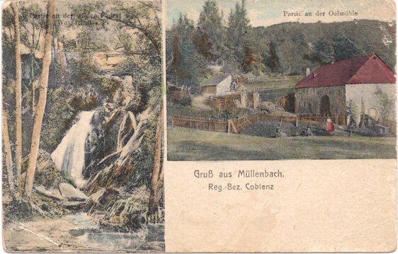 Der Rauschmüller baute, wie gesagt, seine Mühle unten an den Wasserfall, da, wo das Marterbächlein in die Endert läuft, in den Winkel. Das laute Rauschen tat seiner Frau anfangs arg weh in den Ohren und ihm auch. Aber sie waren jung, hatten Geld und leiteten einen Teil des Endertwassers vor dem Wasserfall ab, um damit ihre Mühle zu treiben und zugleich dem Rauschen ein wenig Abbruch zu tun; erst meinten sie, es rausche auch etwas gedämpfter, aber das war eine Täuschung. Doch man gewöhnt sich an alles, auch an das Rauschen eines Wasserfalles und. das Klappern einer Mühle. Und die Rauschmühle sollte ordentlich klappern. Warum war man denn jung, hatte Geld, und mir nichts dir nichts zieht doch keiner aus der Dorfgemeinschaft so allein in ein einsames Tal. Nicht nur die Endert, auch das Marterbächlein hatte Wasser, ein Mühlrad zu treiben, und so waren fast ständig zwei Räder im Gang: eins für Mehl und eins für Öl; und in den vielen Dörfern rundum gab es Kundschaft genug.