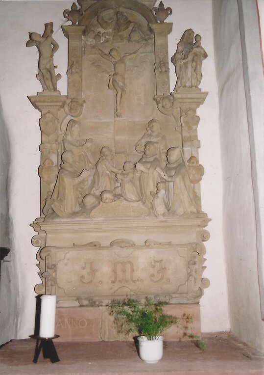 “...Kennfus gestorben und hiehin ante Summi Altare begraben worden. Er hat in seinem Testament ein Epitaphium verordnet, wie solches annoch im Choro bezeichnet mit J und M., Trauben und doppeltem Creutz als seinen Hausmerk zu sehen stehet."