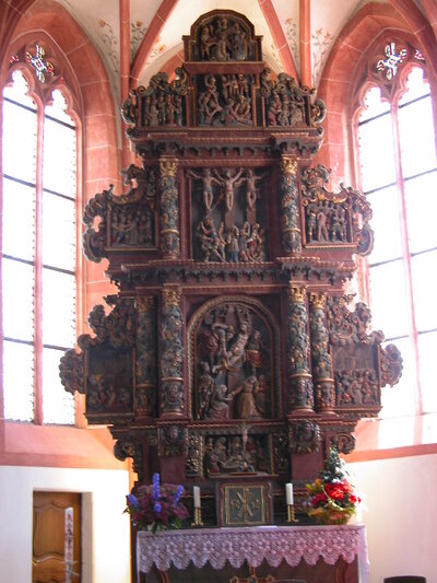 “Woher stammt dieser Altar? Dieser Frage bin ich lange Zeit nachgegangen, ohne zu einem Ergebnis zu kommen. Fest steht folgendes: 1690 war er noch nicht in der Kirche, 1705 wird er zum erstenmal genannt.... Tatsächlich ist an dem Altar eine derbe, harte Künstlerhand unverkennbar, ebenso aber auch eine geübte, feine Künstlerhand; das war das Urteil von Dr. Weyres, jetzt Dombaumeister in Köln. .... Meines Erachtens ist der Altar ein Geschenk des Trierer Churfürsten, der sich nach dem Brand und der Plünderung der Kirche 1687 und 1689 für die Instandsetzung einsetzte.”